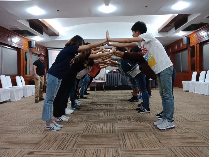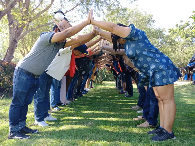 Have everyone to stand in line of two lines by facing each other, then checking the partner hand, make a greeting, then push each partner hands as in the picture. Have each pair step back as much as possible, like the house roof, without any pair falling.